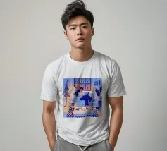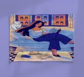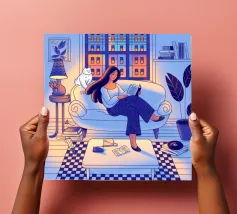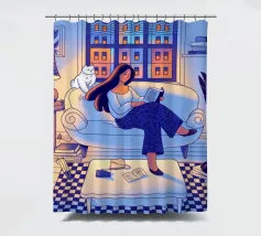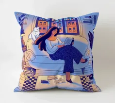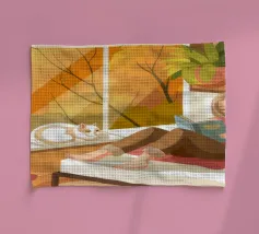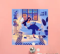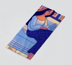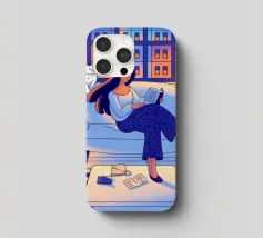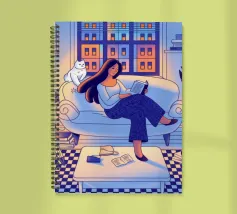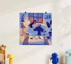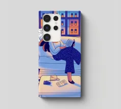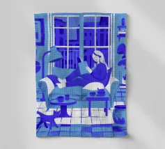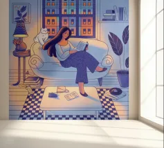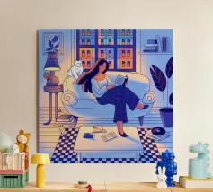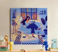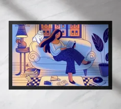 Cette œuvre d'art montre une personne se prélassant sur une chaise, lisant un livre. Le cadre est confortable et l'éclairage chaud d'une lampe à proximité crée une atmosphère paisible et intime.