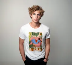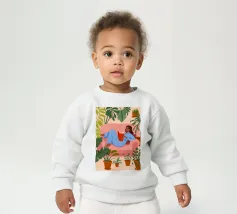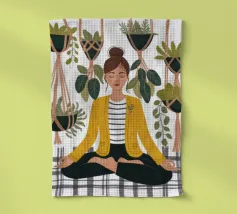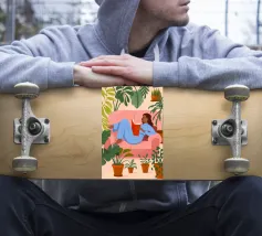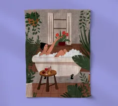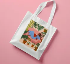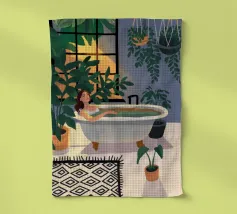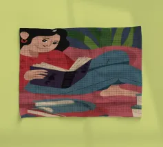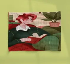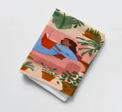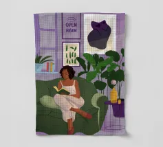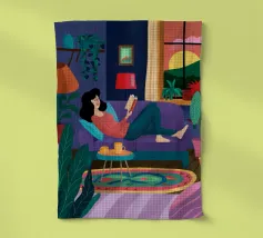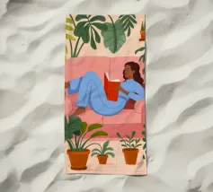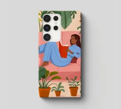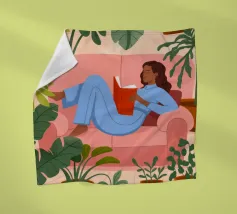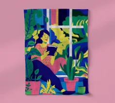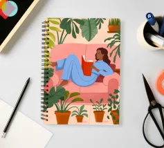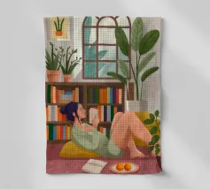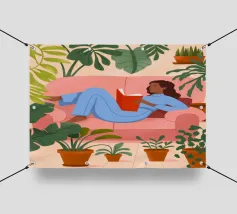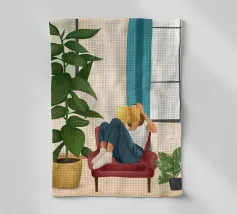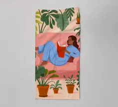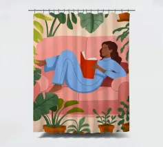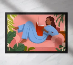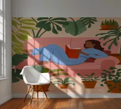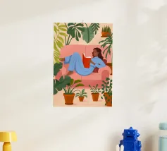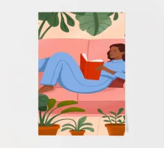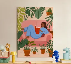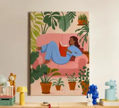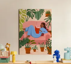 Cette œuvre d'art montre une personne se prélassant sur un canapé rose, absorbée par un livre. La pièce est remplie de plantes en pot, ajoutant une touche de nature à l'intérieur douillet. L'ambiance est détendue et tranquille, parfaite pour une séance de lecture tranquille.