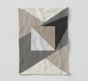 Geometric shapes in neutral tones create an abstract composition with overlapping triangles and a central square. The interplay of light and shadow adds depth to the minimalist design.