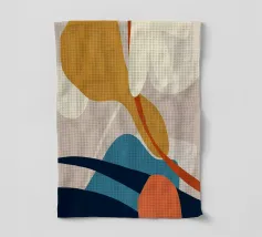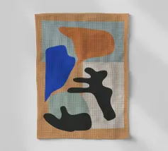 Des formes abstraites sont disposées sur un fond pâle, créant une composition qui suggère un profil facial fragmenté. Des couleurs vives telles que le bleu, l'orange et le noir sont utilisées pour les éléments géométriques, contrastant avec la toile de fond subtile.