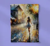 Une femme élégante marche dans une rue mouillée par la pluie dans la douce lumière du soir. Des couleurs expressives et des coups de pinceau impressionnistes confèrent à l'œuvre profondeur, émotion et beauté intemporelle. Parfait pour une décoration murale élégante dans le salon ou le bureau