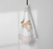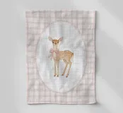 Un jeune fauve mignon avec des taches blanches porte un nœud rose doux, représenté dans un style aquarelle fantaisiste. Parfait pour la décoration d'une chambre d'enfant ou pour les amoureux des animaux.