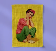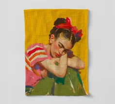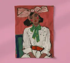 Illustration de style bohème dessinée à la main représentant une jeune fille d'inspiration mexicaine assise à une table verte, portant une chemise rayée rouge et blanche et un nœud rouge dans les cheveux, sur un fond jaune vibrant. Cette œuvre d'art allie l'esthétique moderne du milieu du siècle à des éléments colorés et tendance, ce qui la rend parfaite pour l'art mural, les imprimés de mode et la décoration d'intérieur. Idéale pour ceux qui recherchent des designs artistiques féminins avec une touche rétro, cette pièce ajoute une touche de charme fantaisiste à n'importe quel espace.