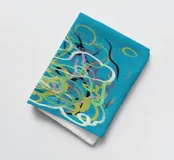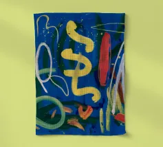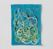 Une variété de lignes colorées enchevêtrées crée une composition abstraite sur un fond turquoise. Des traits se chevauchant de manière complexe dans des tons de jaune, de rose, de blanc et de noir évoquent un chaos fantaisiste.