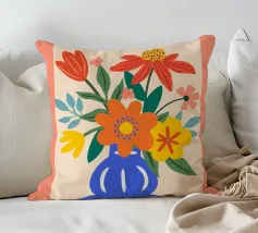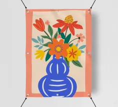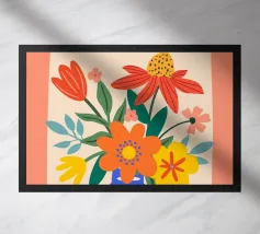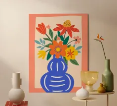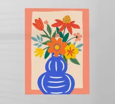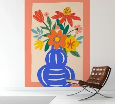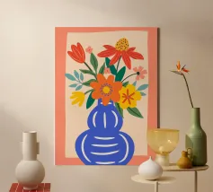 Ce joyeux motif floral représente un vase bleu stylisé rempli de fleurs colorées en orange, rouge, jaune et rose, encadré par un ton corail chaud. Le design respire la joie de vivre et l'harmonie et est parfait pour les tableaux muraux, les coussins, les tasses, les coques de téléphone portable et bien plus encore. Idéal pour tous ceux qui aiment une esthétique fraîche et moderne et qui souhaitent embellir leur intérieur avec des accents colorés et naturels. Cette composition florale intemporelle s'adapte à toutes les pièces et à tous les styles d'intérieur.