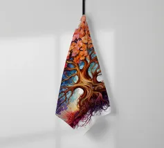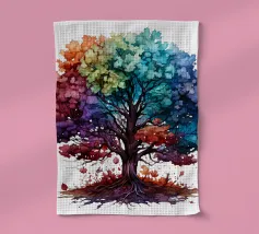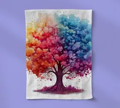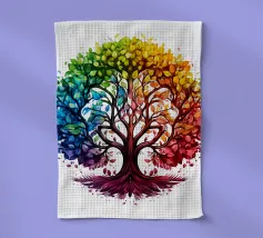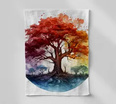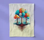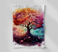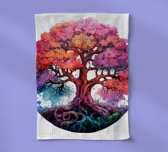Au-dessus du sol, un groupe d'arbres stylisés éclate de couleurs, leurs voûtes formant des sphères d'un bleu, d'un orange et d'un jaune éclatants, dont certaines sont divisées en moitiés contrastantes. Ce joyeux déploiement de couleurs est reflété par un réseau complexe de racines d'un rouge profond sous la surface, symbolisant la force cachée et le lien fondamental qui soutient la vie. Des orbes colorés éparses ajoutent à l'aspect fantaisiste et énergique, évoquant un sentiment d'émerveillement et de croissance. Parfaite pour ajouter une touche de créativité et d'harmonie naturelle à n'importe quel espace, cette pièce célèbre à la fois l'individualité et l'unité.