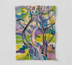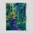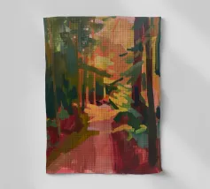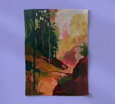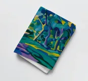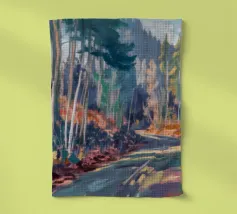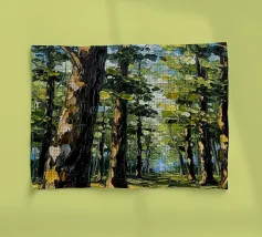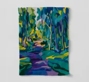 Un paysage expressif et pictural d'un sentier le long d'un ruisseau traversant une forêt. Les bleus, verts et jaunes vibrants créent une représentation dynamique, belle et légèrement abstraite d'une promenade dans la nature.