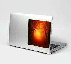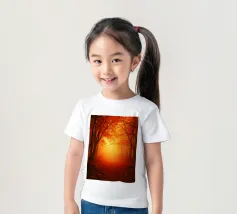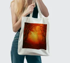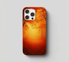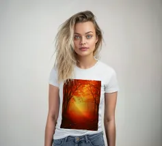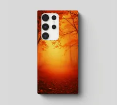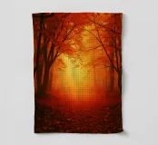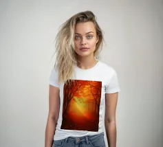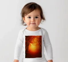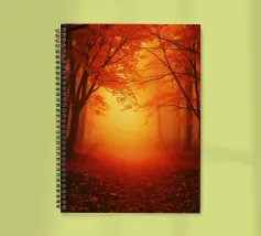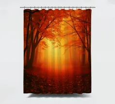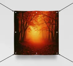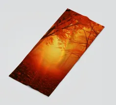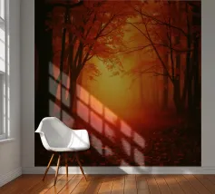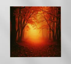 Un sentier forestier à couper le souffle est éclairé par une lumière chaude et dorée au crépuscule. Les arbres luxuriants arborent des feuilles d'un rouge et d'un orange éclatants, créant une atmosphère magique.