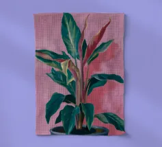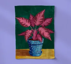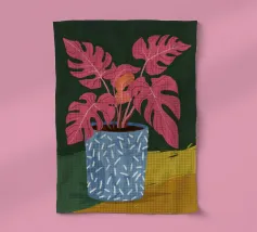 Un anthurium rose saisissant est placé dans un pot coloré à motifs sur un fond rose vif. Cette composition est une célébration audacieuse et élégante de la couleur et des plantes tropicales.