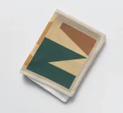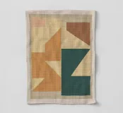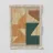 Une œuvre d'art géométrique abstraite avec des formes audacieuses dans des tons terreux orange, vert et beige, disposées sur un fond clair texturé avec une bordure encadrée.