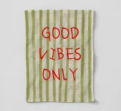 Un message lumineux et encourageant pour une maison heureuse. Cette œuvre d'art lettrée à la main comporte la phrase classique "GOOD VIBES ONLY" sur un fond rayé joyeux.