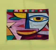 Un mélange chaotique de rouge, de jaune et de bleu divise le visage en sections éparses, reflétant la complexité et l'identité désarticulée. Des lignes griffonnées renforcent sa nature brute et expressive.
