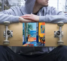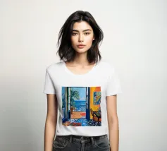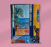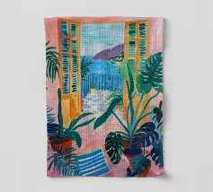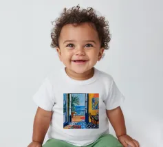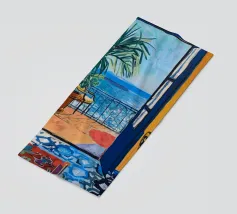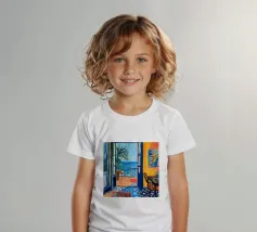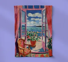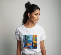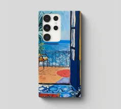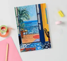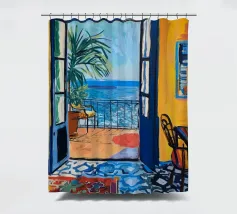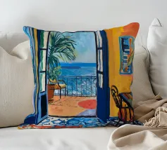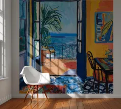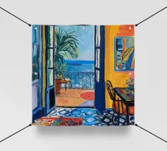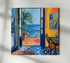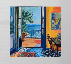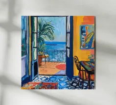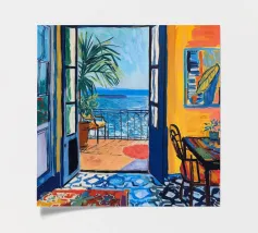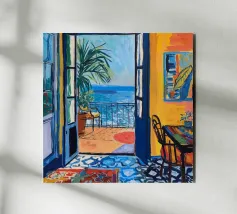 Transportez-vous dans une retraite côtière ensoleillée grâce à cette impression vibrante et expressive d'une vue de bord de mer depuis un intérieur. L'œuvre est peinte avec des coups de pinceau audacieux et une palette intense de jaunes, d'oranges, de bleus et de verts, représentant une pièce s'ouvrant sur un balcon surplombant la mer étincelante. Le style capture la chaleur et la lumière d'une scène méditerranéenne, rappelant le fauvisme. Produite en tant qu'impression d'art numérique de haute qualité avec une résolution impressionnante de 7000x5000 pixels à 300 dpi, elle garantit un niveau de détail exceptionnel et une fidélité à la texture et aux couleurs d'origine, convenant à l'impression en divers formats.