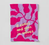 Design statement ludique avec des feuilles roses sur fond lilas et une citation manuscrite "it comes and goes in waves - it always does" en crème doux. Pour tous ceux qui veulent apporter un peu de légèreté et de couleur dans leur quotidien.