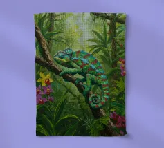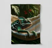 Ce caméléon s'est magistralement adapté au mode de relaxation. Avec ses pattes lâchement posées sur le bord du hamac et un air de pur contentement, il est la preuve vivante que la sieste est parfois un mode de vie. Cette impression fait partie de la série "Jungle Hammock Tales" - la détente estivale avec un clin d'œil. Cette illustration numérique a été créée dans un style photo-réaliste, avec un œil pour la lumière, les détails et l'atmosphère. Elle a été visualisée par Trinkets NL Design Studio à l'aide de l'IA.