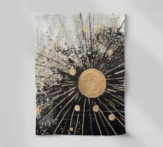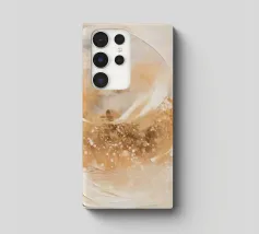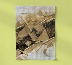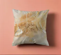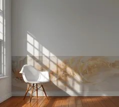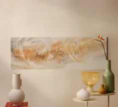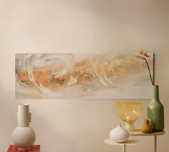 Art moderne avec des formes dorées, des contrastes atténués ainsi qu'une texture orange pêche et des tons de terre légers. Cette peinture abstraite au format panoramique dégage une sérénité intemporelle et contemplative. Les couleurs se fondent en une composition harmonieuse.