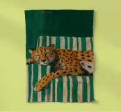 Une œuvre d'art sereine et fantaisiste représentant un guépard faisant paisiblement la sieste sur un canapé vintage à rayures vertes et blanches. Les motifs audacieux et la position confortable du gros chat créent un contraste rêveur et humoristique entre la nature sauvage et la vie domestique décontractée. Parfait pour les amoureux des animaux, les collectionneurs d'art éclectique et les amateurs d'esthétique intérieure ludique.