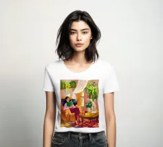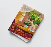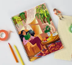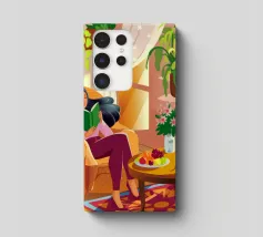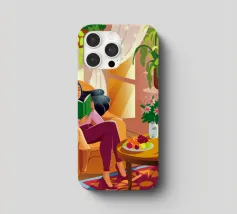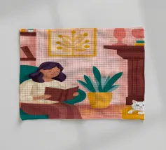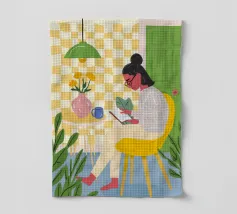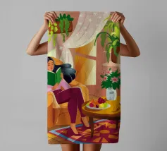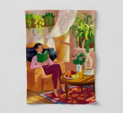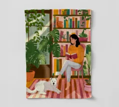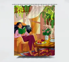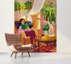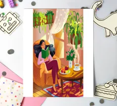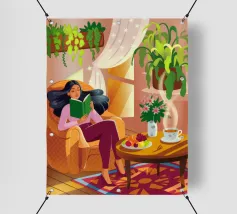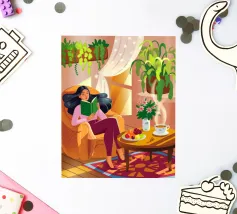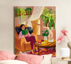 Une personne lit un livre dans une pièce douillette remplie de plantes luxuriantes et d'un éclairage chaleureux. Une théière posée sur une table voisine renforce l'ambiance accueillante et tranquille.
