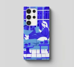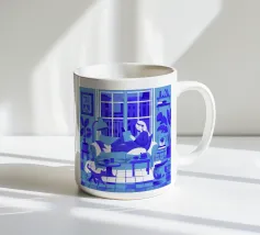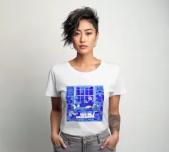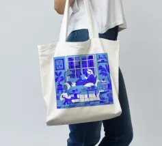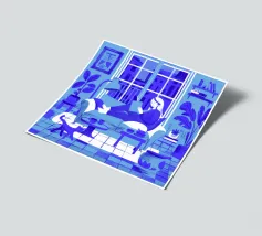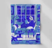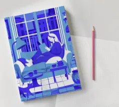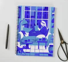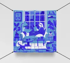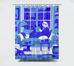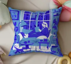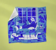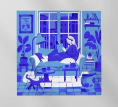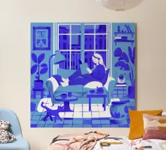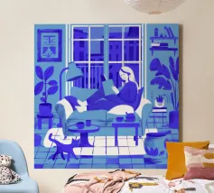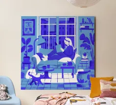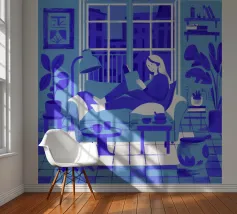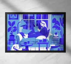 Une personne se détend sur une chaise longue dans une pièce baignée de lumière bleue, entourée de plantes et de livres. La scène est sombre et sereine, et capture l'expérience paisible et immersive de se perdre dans un livre.