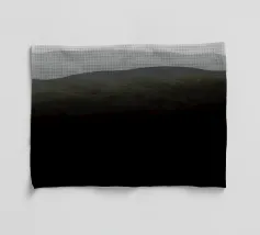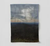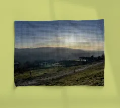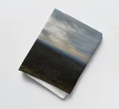 Un vaste paysage s'étend au loin avec des collines ondulantes sous un ciel plutôt nuageux, où le soleil perce, projetant de la lumière sur le terrain. La scène transmet un sentiment de tranquillité et d'ouverture, accentué par les couleurs sourdes d'une fin d'après-midi ou d'un début de soirée.