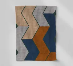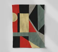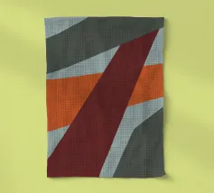 Des formes géométriques abstraites forment une composition avec des lignes diagonales audacieuses qui se croisent à différents angles. La palette se compose de tons sourds, dont le noir, le gris, le beige et la rouille.