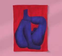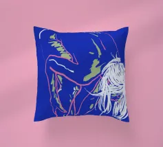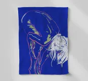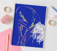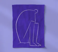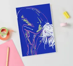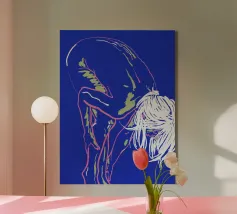 Un fond bleu vibrant sert de cadre à un contour néon frappant d'une personne penchée en avant, la tête pendante. Le style minimaliste capture la figure en quelques couleurs seulement, en utilisant des lignes roses et vertes avec un soupçon de blanc pour les détails.