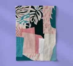 Composition moderne et abstraite présentant un patchwork de motifs et de formes variés. Les éléments comprennent des formes organiques semblables à des feuilles, des grilles géométriques et des textures abstraites dans une palette sourde de rose, de noir et de beige, reflétant un style bohème et éclectique.