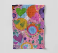 Un patchwork joyeux et réconfortant de plantes stylisées, de motifs vibrants et d'un grand cœur aimant. Cette œuvre d'art éclectique est une célébration joyeuse de l'amour, de la croissance et de la beauté artisanale.