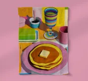 A delicious stack of golden brown pancakes, topped with a melting pat of butter and drizzled with syrup, is the star of this artwork. Presented with colorful mugs, the illustration is a mouth watering celebration of a classic, beloved breakfast treat.