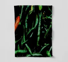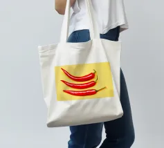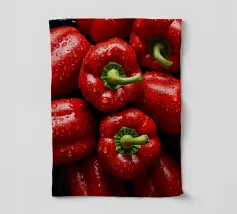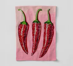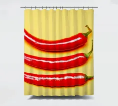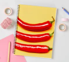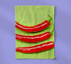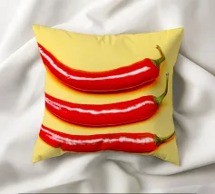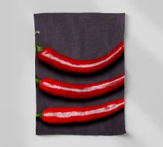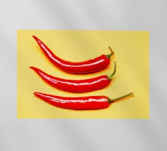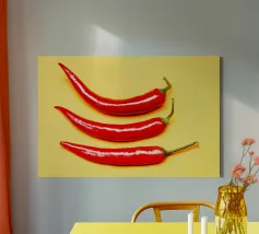 Cette composition minimaliste montre trois piments rouges vifs sur un fond jaune intense. Les piments sont disposés horizontalement et légèrement décalés, ce qui confère à la photo un équilibre dynamique. Leur surface brillante reflète subtilement la lumière, ce qui met particulièrement en valeur la texture naturelle des fruits. Chaque brin de piment possède une tige verte qui contraste par sa couleur et souligne le caractère organique de la scène. Les couleurs vives du rouge et du jaune créent une tension visuelle expressive et transmettent de la vitalité.