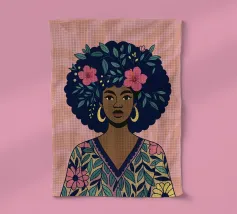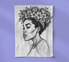 Un dessin au trait audacieux d'une jeune femme confiante aux cheveux volumineux et bouclés, rendu par des traits profonds. Son regard est à la fois calme et puissant, et sa beauté naturelle rayonne depuis le centre de la composition. Des cercles superposés aux couleurs vives - rose vif, jaune soleil, orange riche et lavande - l'entourent comme une aura, symbolisant la joie, la résilience et l'identité. Le contraste entre l'esquisse expressive à l'encre et les aplats de couleurs pop crée un sentiment d'équilibre dynamique et d'élégance moderne.