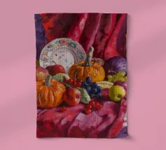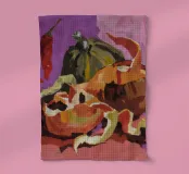 Une nature morte ou une scène de récolte représentant un gros potiron ou une courge orange, des piments rouges et des feuilles vertes, peut-être sur la vigne. L'arrière-plan est un mélange de tons chauds et froids.
