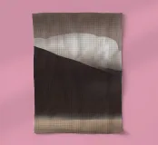 A soft, abstract landscape features a muted color palette with gentle transitions between light and dark shades. A large, white cloud hovers above a dark hill, creating a sense of calm and tranquility.
