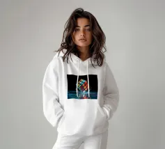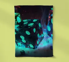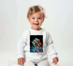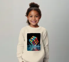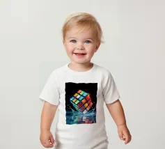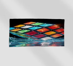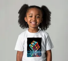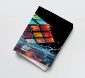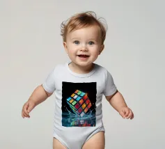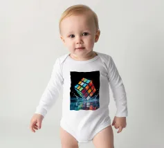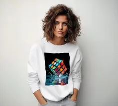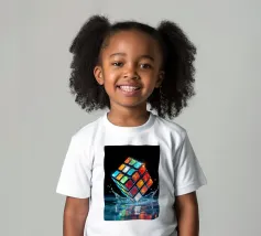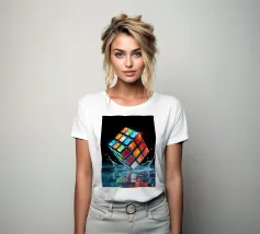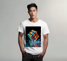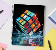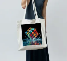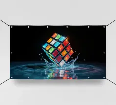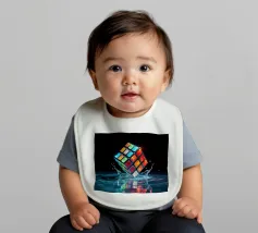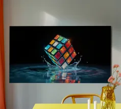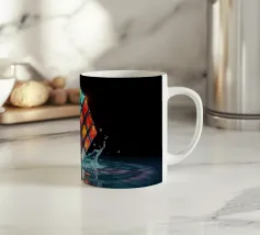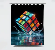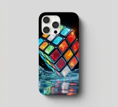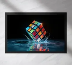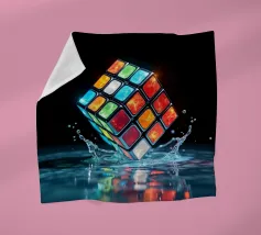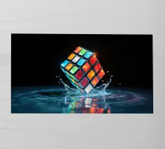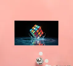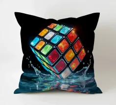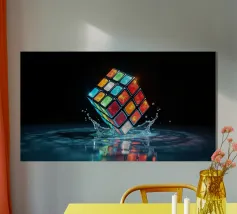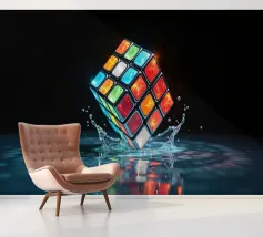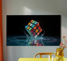 Un Rubik's cube entre en collision avec de l'eau, faisant voler des gouttelettes autour de lui. Les carrés colorés scintillent sous la faible lumière, créant un effet visuel saisissant pendant la nuit.