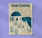 Poster rétro de Santorin, célébrant ses célèbres dômes bleus et façades blanches éclatantes surplombant la mer Égée. Une composition épurée qui capture l’élégance et la lumière des Cyclades, parfaite pour une déco méditerranéenne chic