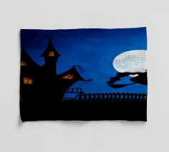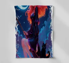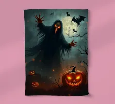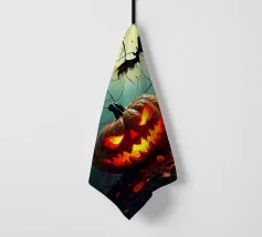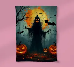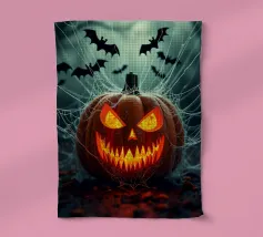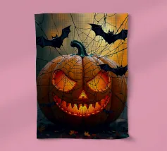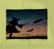 Au crépuscule, la silhouette d'une sorcière vole sur son balai au milieu des chauves-souris, avec une citrouille rougeoyante au premier plan, créant ainsi une atmosphère enchanteresse.