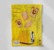 Des tranches de pain grillé avec des visages souriants flottent au-dessus d'un grille-pain jaune. L'arrière-plan comporte un texte sur l'emballage, la production et le mélange, qui met l'accent sur la durabilité et les économies d'énergie.