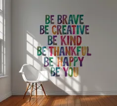 Inspirez et stimulez avec notre impression typographique "Be Brave Be Creative Be Kind Be Thankful Be Happy Be You" (Soyez courageux, soyez créatifs, soyez gentils, soyez reconnaissants, soyez heureux, soyez vous). Ce message stimulant prend vie dans un éventail éblouissant de teintes arc-en-ciel, peintes à la main en lettres fantaisistes à l'aquarelle sur un fond blanc impeccable. Parfait pour les chambres d'enfants, les salles de classe ou tout autre espace ayant besoin d'une touche de couleur et de positivité, ce motif joyeux encourage les jeunes cœurs à s'épanouir. Le style ludique et artistique plaît aux enfants comme aux adultes, ce qui en fait un ajout polyvalent à la maison ou au bureau. Disponible sur différents produits, ce motif e