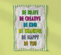 Inspirez et stimulez avec notre impression typographique "Be Brave Be Creative Be Kind Be Thankful Be Happy Be You" (Soyez courageux, soyez créatifs, soyez gentils, soyez reconnaissants, soyez heureux, soyez vous). Ce message stimulant prend vie dans un éventail éblouissant de teintes arc-en-ciel, peintes à la main en lettres fantaisistes à l'aquarelle sur un fond blanc impeccable. Parfait pour les chambres d'enfants, les salles de classe ou tout autre espace ayant besoin d'une touche de couleur et de positivité, ce motif joyeux encourage les jeunes cœurs à s'épanouir. Le style ludique et artistique plaît aux enfants comme aux adultes, ce qui en fait un ajout polyvalent à la maison ou au bureau. Disponible sur différents produits, ce motif e