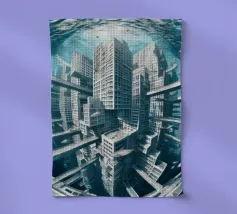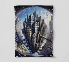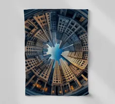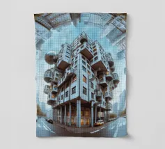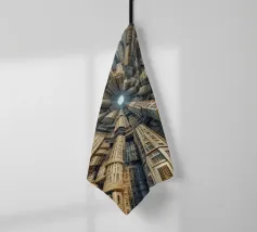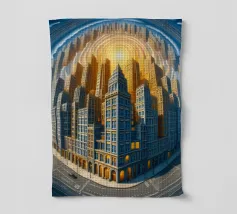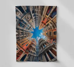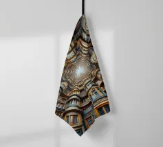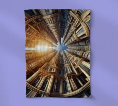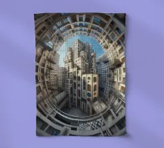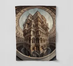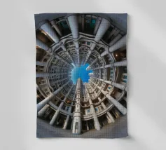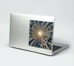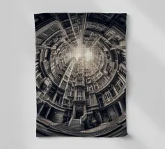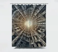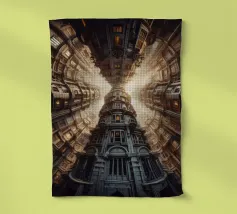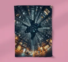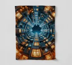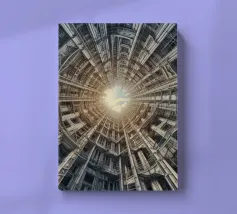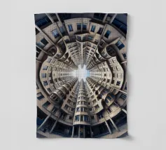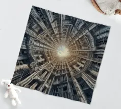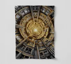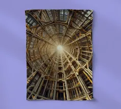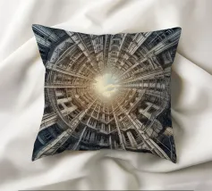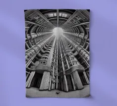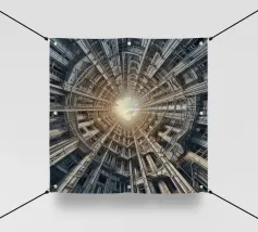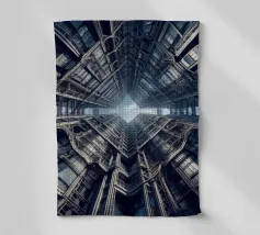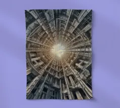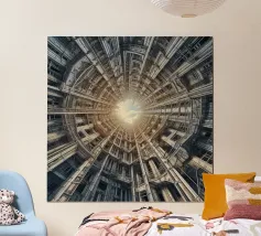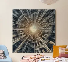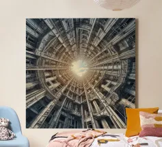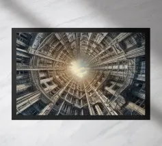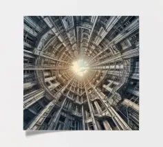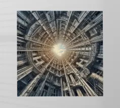 Conception architecturale complexe formant une structure en forme de tunnel avec une symétrie rayonnante, convergeant vers une lumière incandescente au centre. La perspective crée une profondeur et une esthétique futuriste fascinante.