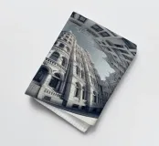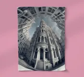 Vue captivante d'un bâtiment de style néoclassique entouré de structures ornementales dans une cour urbaine, obtenue à l'aide d'un objectif fisheye. La perspective déformée met en valeur les détails complexes, la symétrie et la grandeur architecturale de la scène.