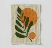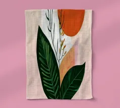 Une étude botanique minimaliste présente une seule branche de feuille stylisée sur un fond beige doux. La chaleur de la composition est rehaussée par un cercle de couleur terracotta ressemblant au soleil, évoquant une impression de sérénité et d'équilibre à la Japandi qui célèbre la simplicité des formes naturelles.