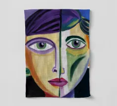 Cette œuvre d'art présente un visage abstrait fragmenté avec des lignes audacieuses et un mélange de couleurs noires, blanches et jaunes. L'arrière-plan est rempli de formes géométriques, ajoutant au thème abstrait général.