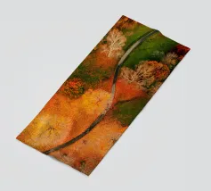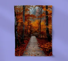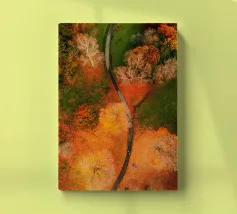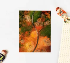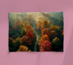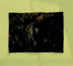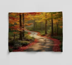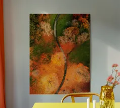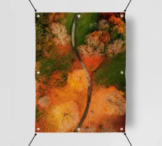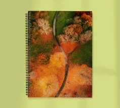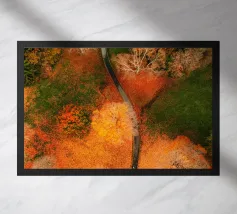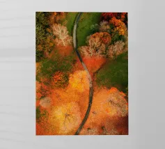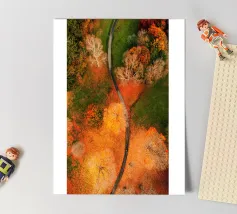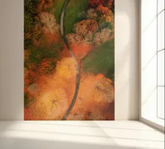 Le sentier s'incurve et s'enroule, révélant un rythme naturel en suivant les contours du terrain. Sa couleur claire contraste avec les tons plus sombres des arbres et du terrain environnants, attirant le regard comme un ruban posé sur la terre. Vu d'en haut, le chemin sinueux raconte une histoire tranquille de voyage, d'exploration et de connexion, guidant le regard du spectateur au loin, vers des lieux inconnus.
