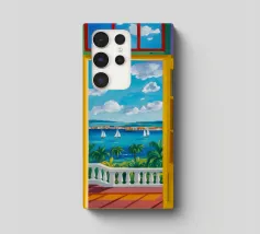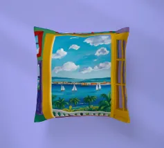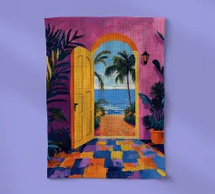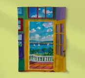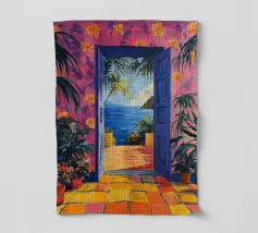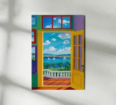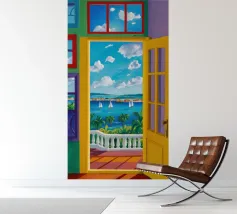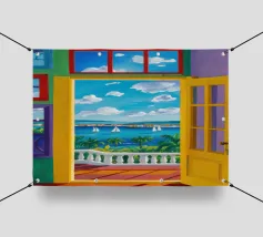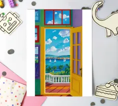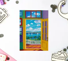 Une porte ouverte jaune vif encadre parfaitement une vue magnifique de la mer, des voiliers et d'une côte lointaine, invitant le spectateur à entrer dans une scène de vacances ensoleillée et idyllique.