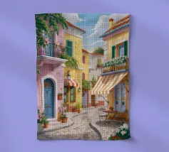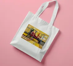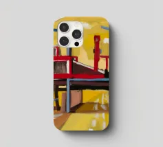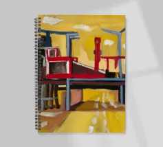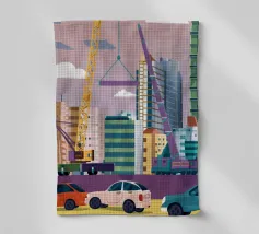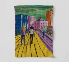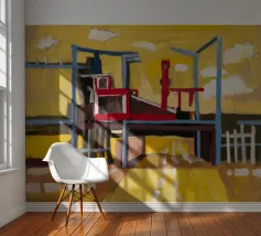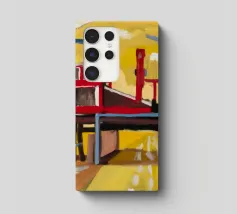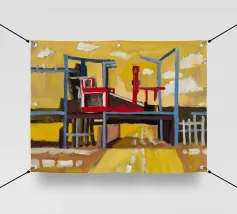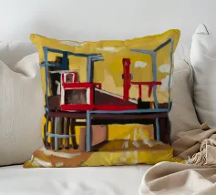 Une vue depuis un train ou un quai surélevé montre un paysage urbain coloré et stylisé avec des formes géométriques audacieuses et un sens aigu de la structure et du mouvement.