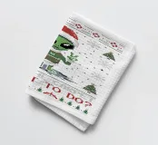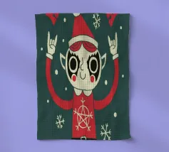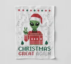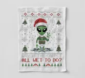 Un extraterrestre portant un chapeau de Père Noël et un pull de Noël est entouré de flocons de neige et d'arbres de Noël. Le dessin pose avec humour la question suivante : "Pourquoi la moquette est-elle toute mouillée ?" dans des couleurs festives.