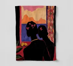 Cette peinture représente deux personnes assises près d'une fenêtre, engagées dans une conversation. Les rideaux verts et leurs vêtements à motifs ajoutent de la profondeur et de la texture à la scène.