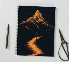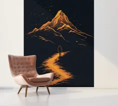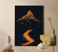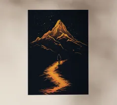 Un mystérieux randonneur avance sur un chemin lumineux à travers un paysage de montagne nocturne - cet artwork allie mysticisme et esprit d'aventure. Le sentier, baigné d'une lumière dorée, mène directement vers un imposant sommet de montagne entouré d'étoiles. Le décor est à la fois calme et significatif et invite à se voir comme un chercheur dans un monde plein de possibilités. Le contraste entre l'obscurité profonde et la lumière chaude crée une atmosphère captivante, particulièrement attrayante pour les amateurs de motifs symboliques et inspirants.