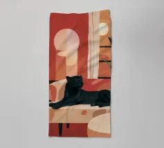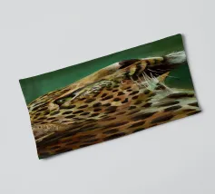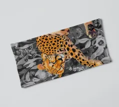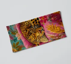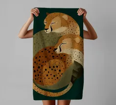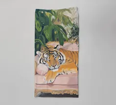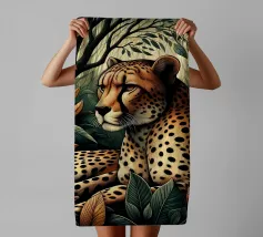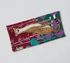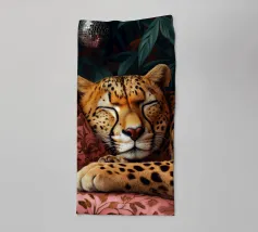 Une œuvre d'art sereine et fantaisiste représentant un guépard faisant paisiblement la sieste sur un canapé vintage à rayures vertes et blanches. Les motifs audacieux et la position confortable du gros chat créent un contraste rêveur et humoristique entre la nature sauvage et la vie domestique décontractée. Parfait pour les amoureux des animaux, les collectionneurs d'art éclectique et les amateurs d'esthétique intérieure ludique.